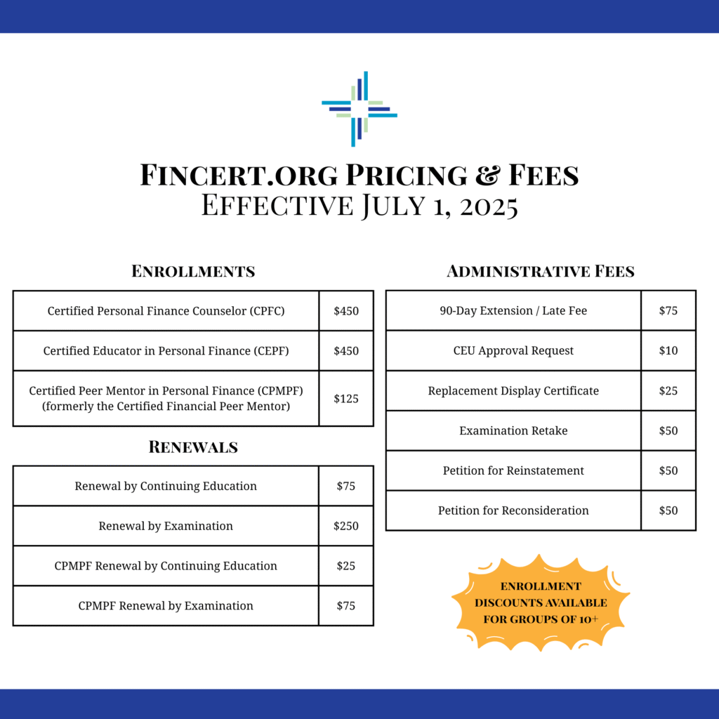 Reminder: Our first price adjustment in over a decade went into effect July 1, 2025. These changes will help us continue providing quality service and support. For the complete list of certification and renewal fees, please visit the Payments tab. If you have an outstanding invoice from before July 1, please email us for payment options. Thank you for choosing Fincert! Dismiss